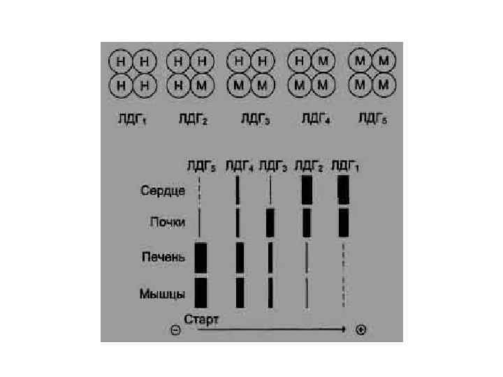 ЛДГ - олигомерный белок, состоящий из 4 субъединиц 2 типов: М (от англ. , muscle - мышца) Н (от англ. , heart - сердце). Комбинация этих субъединиц лежит в основе формирования 5 изоформ ЛДГ 1 и ЛДГ 2 наиболее активны в сердечной мышце и почках. ЛДГ 4 и ЛДГ 5 - в скелетных мышцах и печени. В остальных тканях имеются различные формы этого фермента.