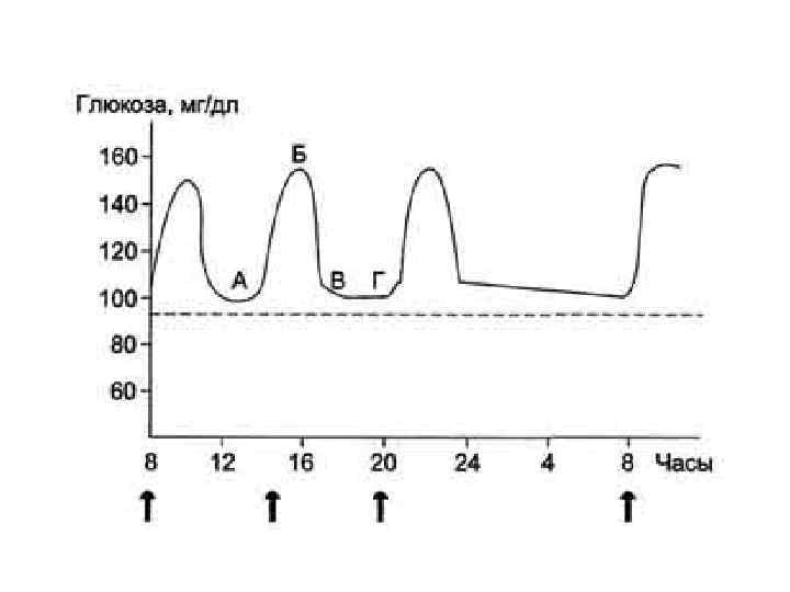 Основной показатель углеводного обмена в крови – концентрация глюкозы Концентрация глюкозы в артериальной крови в течение суток поддерживается на постоянном уровне 3, 3– 5, 5 ммоль/л. После приёма углеводной пищи уровень глюкозы возрастает в течение примерно 1 ч до ∼ 8 ммоль/л, (алиментарная гипергликемия), а затем возвращается к нормальному уровню (примерно через 2 ч).