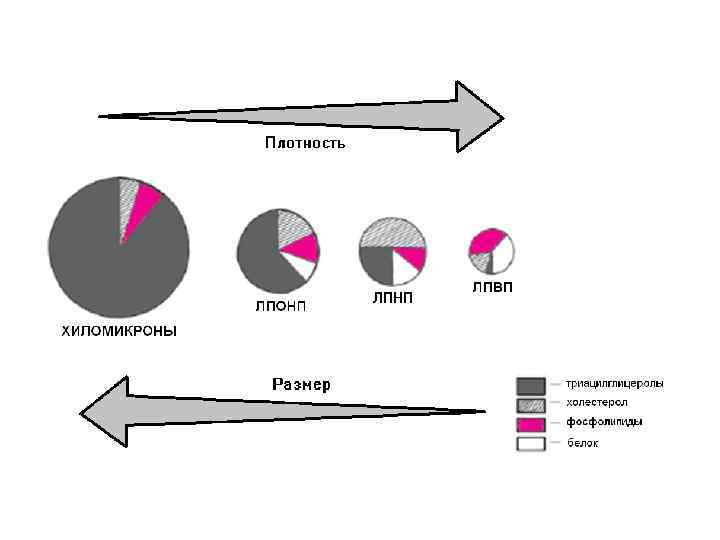 Основные фракции липопротеинов крови: Хиломикроны (ХМ); Липопротеины очень низкой плотности (ЛПОНП); Липопротеины промежуточной плотности (ЛППП); Липопротеины низкой плотности (ЛПНП); Липопротеины высокой плотности (ЛПВП).