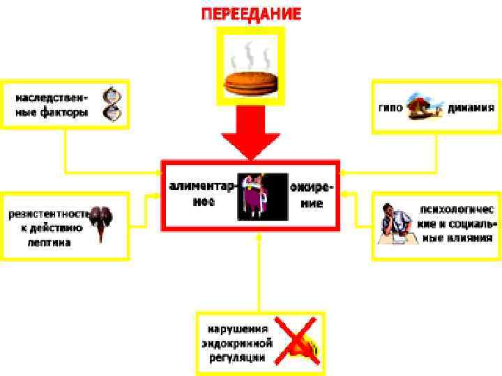 Лептиновый механизм развития ожирения Ø Ø Ø . ‡ Лептин образуется в жировых клетках: уменьшает аппетит и повышает расход энергии организмом. Уровень лептина в крови прямо коррелирует с количеством белой жировой ткани. Рецепторы к лептину имеют ядра гипоталамуса. Лептин подавляет образование и выделение гипоталамусом нейропептида Y. ‡ Нейропептид Y формирует чувство голода, повышает аппетит, снижает энергорасходы организма. Гипоталамус и жировая ткань взаимодействуют по типу «отрицательной обратной связи» : избыточное потребление пищи, сопровождающееся увеличением массы жировой ткани, приводит к усилению секреции лептина. Это (посредством торможения выработки нейропептида Y) ослабляет чувство голода. При метаболическом синдроме, несмотря на повышенное его содержание в крови, утрачивается чувствительность гипоталамических центров к нему и развивается относительная лептинорезистентность.