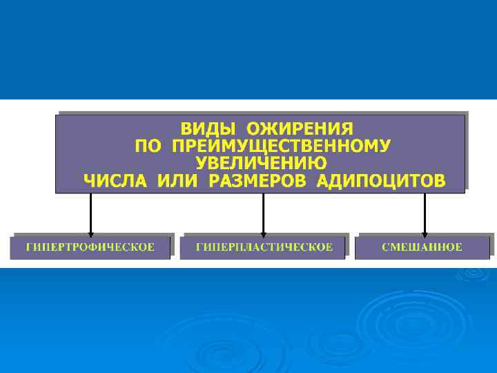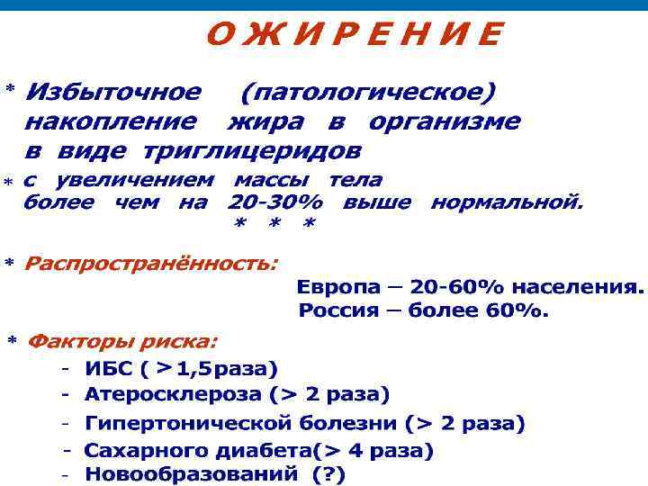 Основные механизмы «ожирения» жировой ткани: Ø Избыточное, превышающее энергозатраты, потребление жиров, углеводов (↑ липогенез) Ø Недостаточное использование жира при нормальной функции пищевого центра (↓ липолиз) Ø Активация синтеза триглицеридов при избыточной продукции инсулина