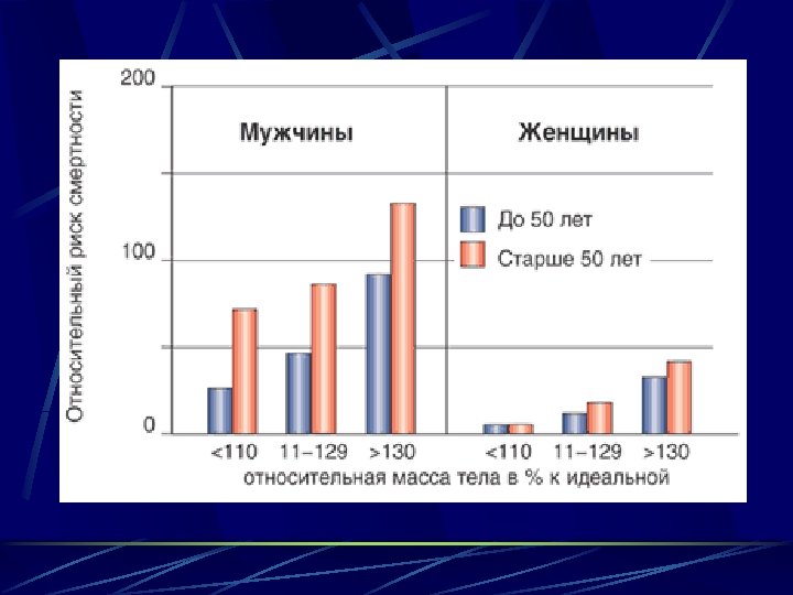Фрамингемское исследование Результаты Фрамингемского исследования (26 -летнее наблюдение) показали, что частота сердечно-сосудистых заболеваний в целом, ИБС, инфаркта миокарда возрастала в зависимости от избытка массы тела (в процентах к идеальной) у мужчин и женщин.