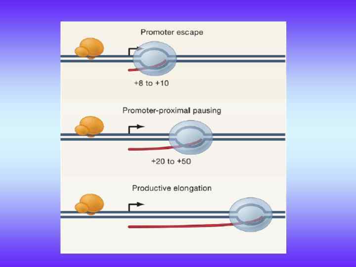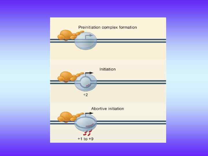 РНК-полимераза Промотор Полимераза слабо связывается с промотором, формируя закрытый комплекс Полимераза связывается более плотно, ДНК расплетается в области -10, формируется открытый комплекс. Рибонуклеотид трифосфаты После начала синтеза РНК, как только полимераза минует промотор, σсубъединица диссоциирует