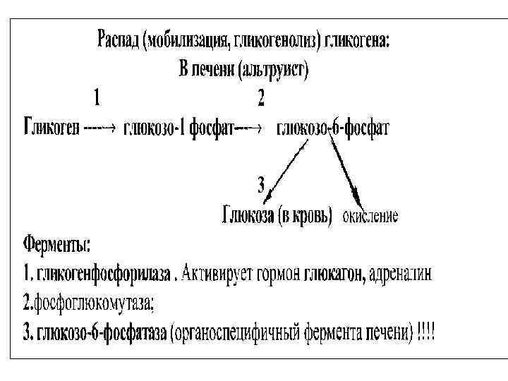 Синтез гликогена Глюкоза – 6 - фосфат УДФ-глюкоза + 1 глюкоза -1 -фосфат гликоген ( глюкоза - n ) +УТФ 2 3 гликоген (глюкоза n+1) Ферменты: 1. Фосфоглюкомутаза; 2. Глюкозо-1 -фосфатуридинтрансфераза 3. Гликогенсинтаза. Регуляторный. Активирует гормон инсулин.