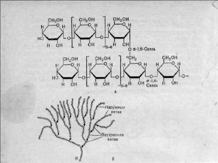 Основные углеводы пищевых продуктов полисахариды: крахмал, гликоген, целлюлоза дисахариды: сахароза-( глюкоза+ фруктоза); мальтоза-( глюкоза+ глюкоза); лактоза - (глюкоза+ галактоза); моносахариды: глюкоза, фруктоза, галактоза Связи между мономерами L - 1, 4 – гликозидная!!! L - 1, 6 - гликозидная β -1, 4 –гликозидная- (нерасщепляется ферментами ЖКТ Целлюлоза – не переваривается, т. е. не является источником глюкозы, но необходима для перистальтики кишечника, формирования каловых масс. Связывания токсичных соединений в кишечнике.