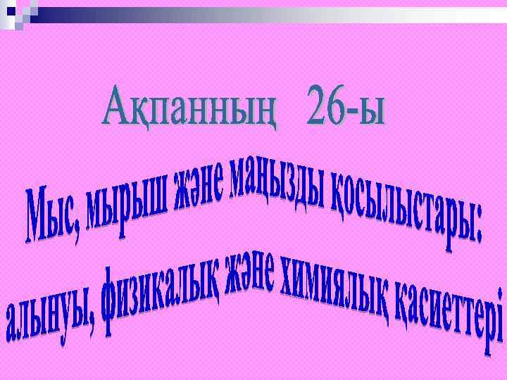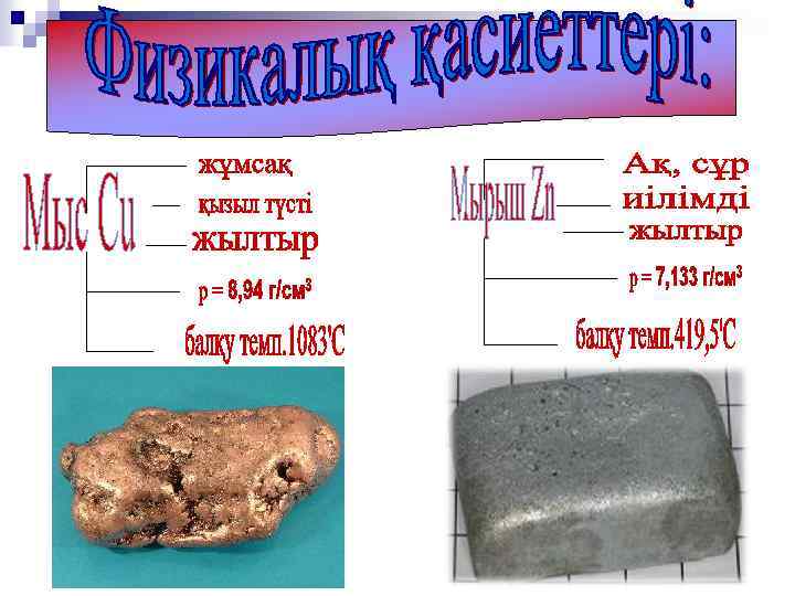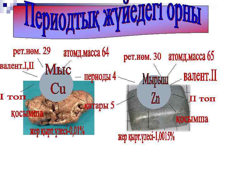 ■ Мыс, мырыш металының периодтық жүйедегі орны ■ Мыс, мырыш металдарының физикалық қасиеттері ■ Мыс, мырыш металдарының алыну жолдары ■ Мыс, мырыш металдарының химиялық қасиеттері ■ Мыс, мырыш металдарының қолданылуы ■ Мыс, мырыш өндіретін кен орындар ■ Мыс, мырыш қосылыстары