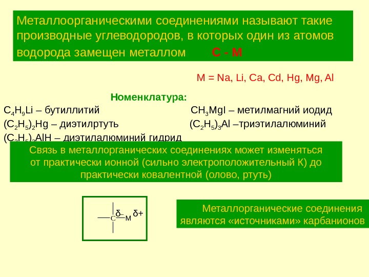 Металлоорганическими соединениями называют такие производные углеводородов, в которых один из атомов водорода замещен металлом С — М М = Na, Li, Ca, Cd, Hg, Mg, Al Номенклатура: C 4 H 9 Li – бутиллитий CH 3 Mg. I – метилмагний иодид (С 2 H 5 ) 2 Hg – диэтилртуть (C 2 H 5 ) 3 Al – триэтилалюминий (C 2 H 5 ) 2 Al. H – диэтилалюминий гидрид Связь в металлорганических соединениях может изменяться от практически ионной (сильно электроположительный К) до практически ковалентной (олово, ртуть) Металлорганические соединения являются «источниками» карбанионов. CMδ _ δ +