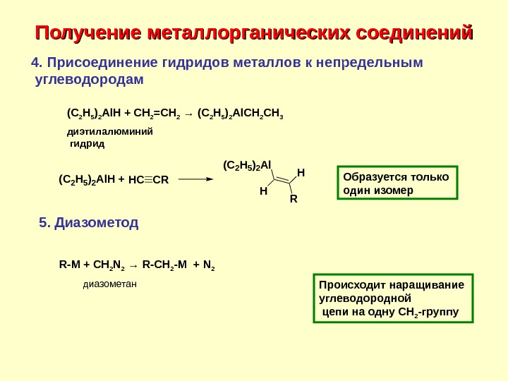 Получение металлорганических соединений(C 2 H 5)2 Al. H +HCCR H R (C 2 H 5)2 Al H 4. Присоединение гидридов металлов к непредельным углеводородам (C 2 H 5 ) 2 Al. H + CH 2 =CH 2 → (C 2 H 5 ) 2 Al. CH 2 CH 3 диэтилалюминий гидрид R-M + CH 2 N 2 → R-CH 2 -M + N 2 Образуется только один изомер 5. Диазометод диазометан Происходит наращивание углеводородной цепи на одну СН 2 -группу
