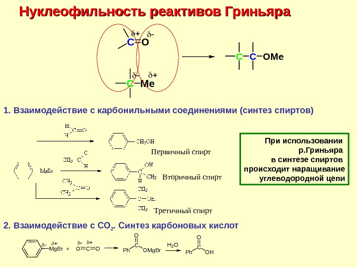 CMg. XCMg — XХимические свойства реактивов Гриньяра Реактивы Гриньяра и другие металлоорганические соединения участвуют в химических превращениях как мощнейшие основания и нуклеофилы. Синтезы на основе реактивов Гриньяра