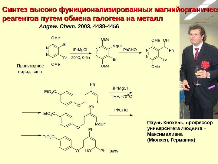 Синтез высоко функционализированных магнийорганических реагентов путем обмена галогена на металл Пауль Кнохель, профессор университета Людвига – Максимилиана (Мюнхен, Германия)Angew. Chem. 2003, 4438 -4456 N N O M e B r O M e i P r M g C l 2 0 0 C , 0. 5 h N N O M e M g C l B r O M e N N O M e B r O M e O H P h C H O Производное пиридазина P h C H OE t O 2 C O IP h i P r M g C l T H F , — 7 0 0 C E t O 2 C O M g B r. P h E t O 2 C O P h. H O 8 8 %