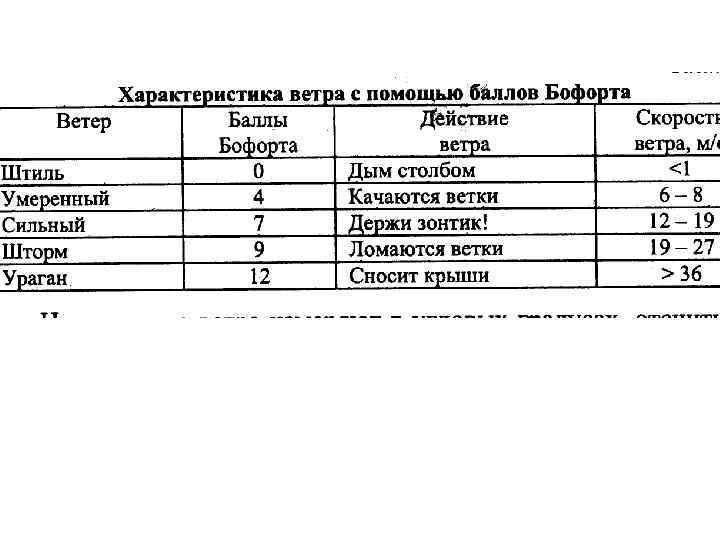 Ветер • Ветер – движение воздуха с преобладанием горизонтальной составляющей скорости. • Ветер характеризуется скоростью и направлением. Существует еще характеристика – порывистость ветра. • Порывистость ветра – мгновенные изменения скорости и направления. • Скорость измеряется в м/с, редко км/час. Кроме того, для оценки скорости используют шкалу Бофорта. • Направление ветра измеряют в угловых градусах, отсчитывая от направления на север по часовой стрелке. Кроме того, направление определяется румбом или азимутом той точки горизонта, откуда дует ветер.