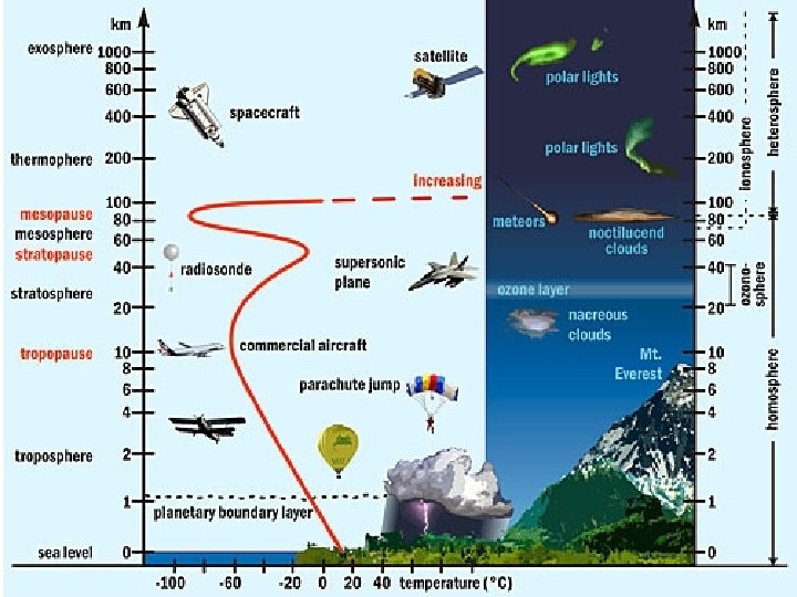 D. Thermosphere 17. From 80 km out into space. 18. The thin air of this layer gradually merges with space. 19. Temperature increases rapidly with altitude. 20. Temperature ranges from -90 C to over 1000 C. 21. High temp – due to thermosphere absorbing solar radiation, the molecules move very fast. 22. Auroras & meteors occur here.