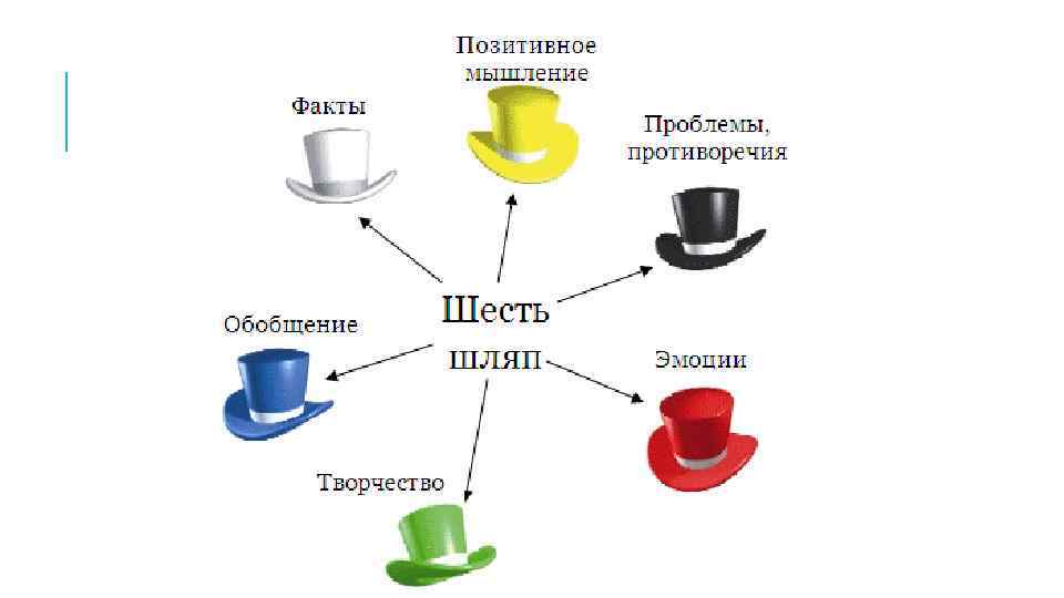 СУТЬ МЕТОДА Шесть шляп мышления - простой и практический способ, позволяющий преодолеть три фундаментальные трудности, связанные с практическим мышлением: эмоции, беспомощность, путаницу. Метод позволяет разделить мышление на шесть типов, или режимов, каждому из которых отвечает метафорическая цветная "шляпа". Такое деление позволяет использовать каждый режим намного эффективнее, и весь процесс мышления становится более сфокусированным и устойчивым.