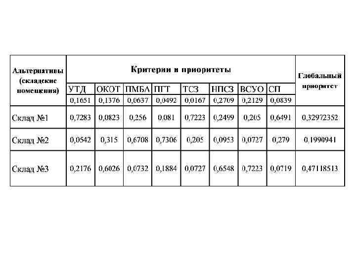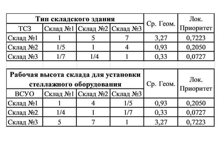 Решение задачи • Выбора складского помещения • Фирме требуется выбрать складское помещение. Менеджерами были названы 8 критериев, по которым оценивается помещение для покупки