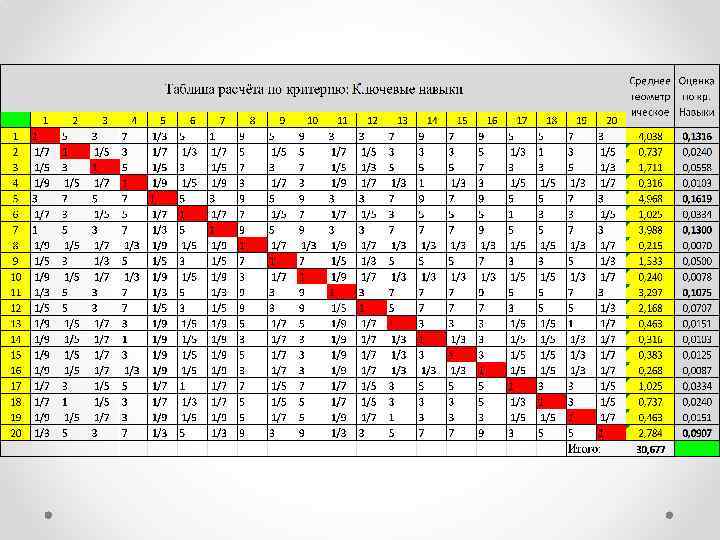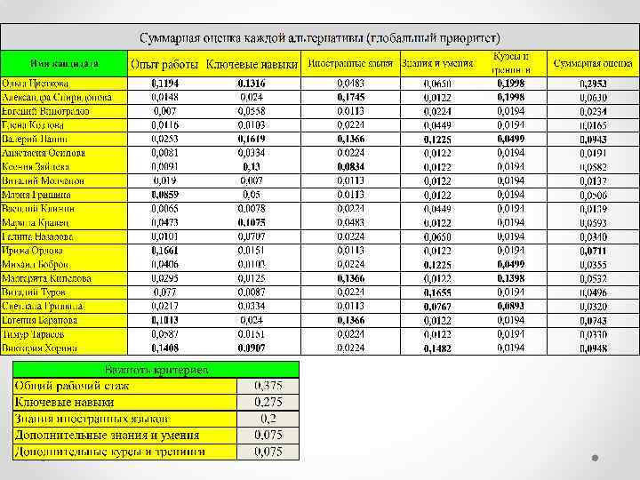 Отбор специалистов осуществляется по пяти критериям. Важность критериев Общий рабочий стаж 0, 375 Ключевые навыки 0, 275 Знания иностранных языков 0, 2 Дополнительные знания и умения 0, 075 Дополнительные курсы и тренинги 0, 075