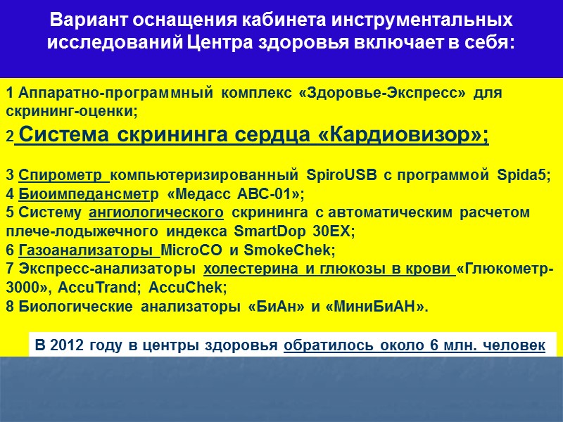 Вариант оснащения кабинета инструментальных исследований Центра здоровья включает в себя: 1 Аппаратно-программный комплекс «Здоровье-Экспресс» для скрининг-оценки; 2 Система скрининга сердца «Кардиовизор»; 3 Спирометр компьютеризированный SpiroUSB c программой Spida5; 4 Биоимпедансметр «Медасс АВС-01»; 5 Систему ангиологического скрининга с автоматическим расчетом плече-лодыжечного индекса SmartDop 30EX; 6 Газоанализаторы MicroCO и SmokeChek; 7 Экспресс-анализаторы холестерина и глюкозы в крови «Глюкометр-3000», АccuTrand; АссuСhek; 8 Биологические анализаторы «БиАн» и «МиниБиАН». В 2012 году в центры здоровья обратилось около 6 млн. человек