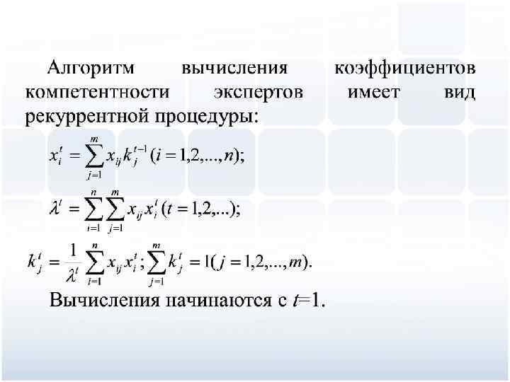 Коэффициенты компетентности экспертов можно вычислить по апостериорным данным, т. е. по результатам оценки объектов. Основной идеей этого вычисления яв ляется предположение о том, что компетентность экспертов должна оцениваться по степени согласованности их оценок с групповой оценкой объектов.