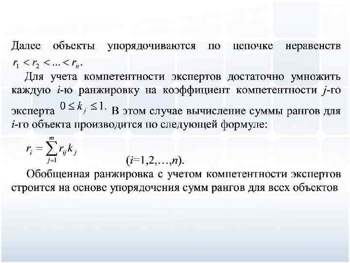 В ряде случаев при формализации экспертных оценок используется свойство аддитивности, которое присуще только шкале отношений. Наличие аддитивности выражается следующими аксиомами : • • если j = a и i > 0, то i + j > a; i + j = j + i; если i = a и j = b, то i + j = a + b; (i + j) + k = i + (j + k).