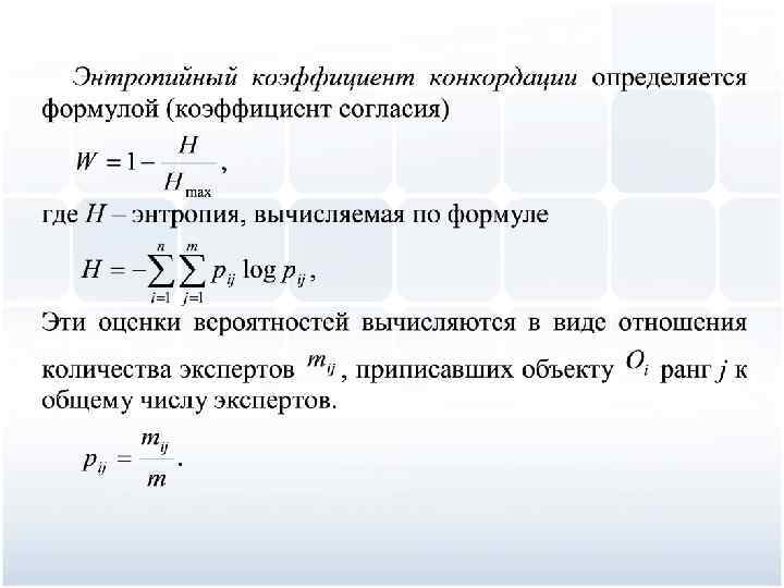 При ранжировании объектов эксперты обычно расходятся во мнениях по решаемой проблеме. В связи с этим возникает необходимость количественной оценки степени согласия экспертов. Получение количественной меры согласованности мнений экспертов позволяет более обоснованно интерпретировать причины в расхождении мнений. В настоящее время известны две меры согласованности мнений группы экспертов: дисперсионный и энтропийный коэффициенты конкордации.