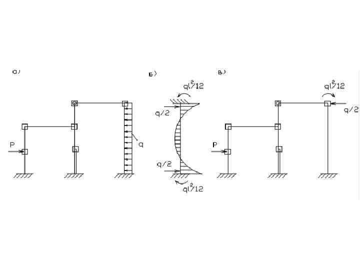 Число степеней свободы КЭ, а в конечном итоге число неизвестных МКЭ, определяется количеством наложенных в узлах дополнительных связей. В узлах, где отдельные элементы соединяются между собой жестко, имеется три неизвестных перемещения, в шарнирных узлах – два. Следовательно, количество неизвестных МКЭ можно определить: n = 3 nж. уз. + 2 nш. уз. Каждый элемент является частью заменяемой среды, т. е. сплошное тело лишь условно делится на отдельные элементы конечных размеров. Выделенный элемент имеет те же физические свойства и геометрические характеристики, что и рассматриваемая конструкция в месте расположения элемента. б) узловые сопряжения Между собой КЭ могут соединяться жестко или с помощью шарнира. Точки соединения элементов в МКЭ называют узловыми или узлами. в) преобразование нагрузок Кроме того, алгоритм МКЭ требует, чтобы все внешние нагрузки, действующие на сооружение, были приложены к узловым точкам ее дискретной модели. Поэтому, точки приложения сосредоточенных сил делают узловыми, а нагрузки распределенные по длине стержня, преобразуют к узловым.