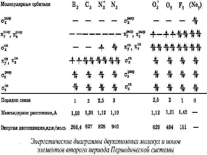 3. Образование МО и распределение электронов представляется с помощью энергетических диаграмм. Горизонтальные линии по краям диаграмм соответствуют энергии каждой из АО отдельного атома, середине - энергиям соответствующих МО. Энергии базисных АО ns и np - элементов 1, 2, 3 периодов представлены в таблице 1. Энергетическая диаграмма для молекулы кислорода О 2 представлена на рисунке 1. При построении энергетических диаграмм следует учитывать взаимное влияние близких по энергиям МО. Если разница энергий комбинируемых АО данного атома мала (менее 12 э. В) и они имеют сходную симметрию относительно оси связи, например 2 s- и 2 p - АО от лития до азота, то наблюдается дополнительное, т. е. конфигурационное взаимодействие МО. Такое взаимодействие приводит к тому, что на энергетической диаграмме связывающие - МО располагаются выше, чем связывающие - и - МО, например, для двухатомных P молекул от Li 2 до N 2. 4. В соответствии с методом МО молекулярная система может образоваться, если число электронов на связывающих МО превышает число электронов на разрыхляющих МО. Т. е. осуществляется выигрыш в энергии по сравнению с изолированным состоянием частиц. Порядок связи (ПС) в двухатомной частице, определяемый как полуразность числа связывающих и разрыхляющих электронов, должен быть больше нуля. Так, ПС = 2 для молекулы кислорода O 2. Наличие в молекулах электронов на несвязывающих МО не изменяет ПС, но приводит к некоторому ослаблению энергии связи за счет усиления межэлектронного отталкивания. Указывает на повышенную реакционную способность молекулы, на тенденцию перехода несвязывающих электронов на связывающие МО.