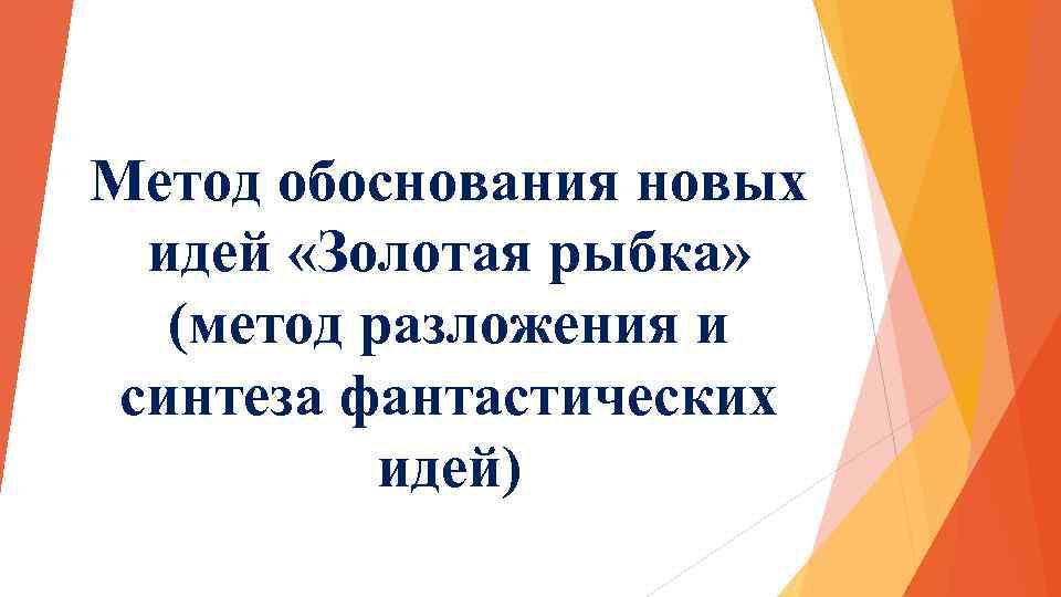 Суть метода Разделение ситуации на реальную и фантастическую составляющие с дальнейшим нахождением реальных проявлений фантастической составляющей. Пример. «… В третий раз закинул он невод – Пришел невод с одною рыбкой, С непростою рыбкой – золотою, Как взмолится золотая рыбка! Голосом молвит человечьим: - Отпусти ты, старче, меня в море! Дорогой за себя дам откуп: Откуплюсь, чем только пожелаешь. »