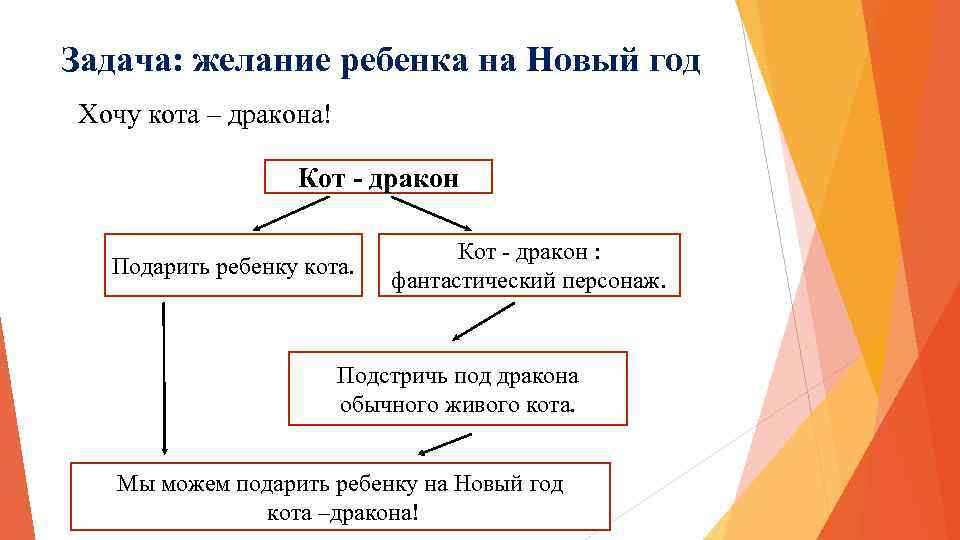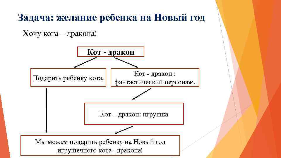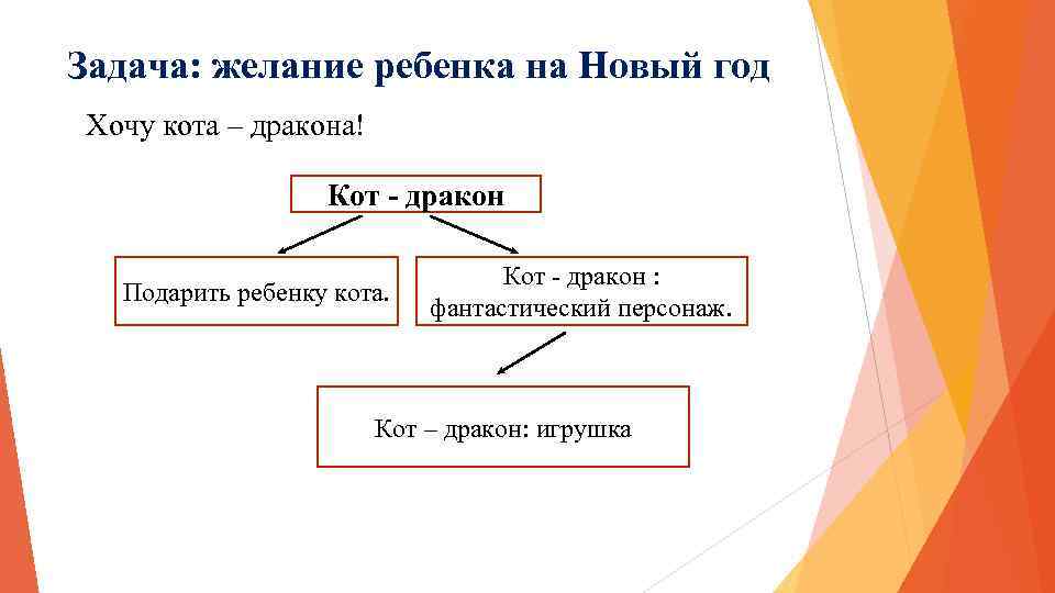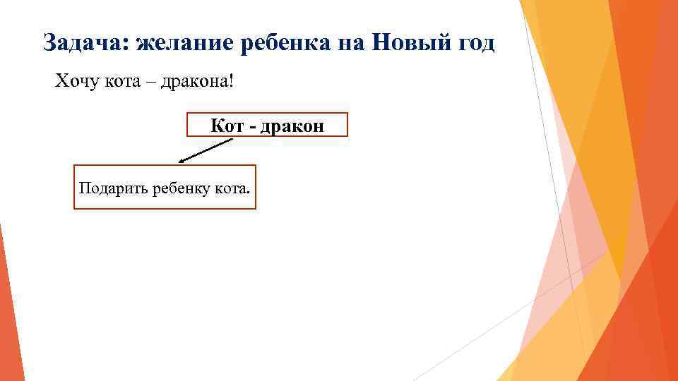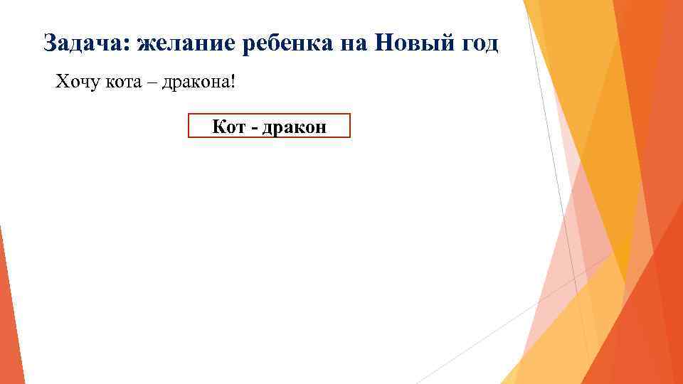 Задача: желание ребенка на Новый год Хочу кота – дракона! Кот - дракон Подарить ребенку кота. Кот- дракон – фантастический персонаж.