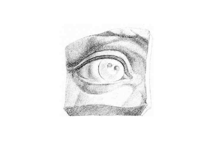 Рисование гипсовой модели глаза по методу Чистякова Рисунок слепка глаза начните с намеченной на бумаге общей формы. Прежде чем объяснить принципы ведения изображения, приведем слова П. П. Чистякова, раскрывающие предлагаемую им методику рисования гипсовой модели глаза: «Перед нами поставлен пиковый глаз, положим, Аполлона, под углом 20° к плоскости. Прежде всего, назначив место на плоскости, надо определить уходящий угол плоскости гипсовой. Потом означить положение глаза, или место, на этой плоскости. Начинать просто, рассуждая, положим, так. Плоскость найдена, теперь глаз находится на высоте такой то, проверить высоту — расстояния снизу и сверху. Сразу глаз тонко не вычерчивать, а так просто искать место его. Положение по отвесной линии найдено, пойти по горизонтали: от переносицы на столько то, от другого переносья проверить, глядя вдруг, быстро, несколько раз. Потом вдруг взглянуть и определить положение глаза от слезника до наружного края относительно горизонта, потом нужно рисовать веко, положим, верхнее. От наружного края глаза веко идет вверх — до сих пор, здесь перелом и линия идет вниз к слезнику. Нижнее веко так же. Потому нужно перекинуть прямую от точки переносья верхнего века на точку переносья нижнего века. Следует чувствовать форму между носом и слезником. . . После того как глаз нарисован, нужно строго определить главные тени, продолжать оканчивать, выводя тени до мелочей. Потом нанести тени, и глаз готов» .