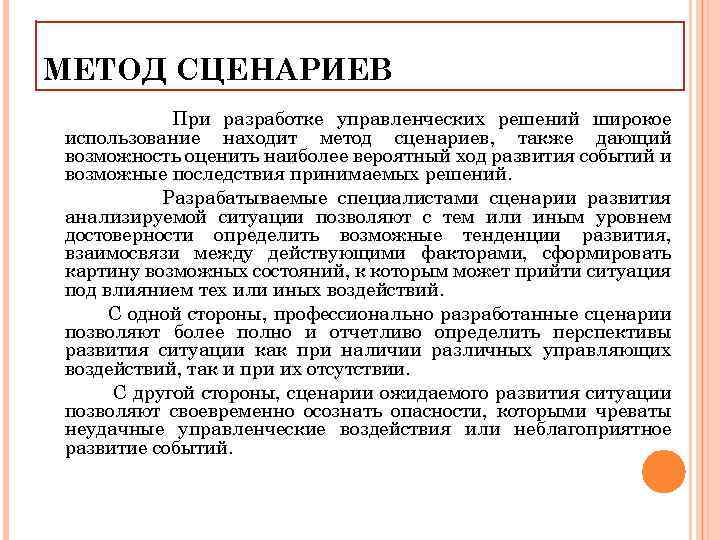 МЕТОД СЦЕНАРИЕВ При разработке управленческих решений широкое использование находит метод сценариев, также дающий возможность оценить наиболее вероятный ход развития событий и возможные последствия принимаемых решений. Разрабатываемые специалистами сценарии развития анализируемой ситуации позволяют с тем или иным уровнем достоверности определить возможные тенденции развития, взаимосвязи между действующими факторами, сформировать картину возможных состояний, к которым может прийти ситуация под влиянием тех или иных воздействий. С одной стороны, профессионально разработанные сценарии позволяют более полно и отчетливо определить перспективы развития ситуации как при наличии различных управляющих воздействий, так и при их отсутствии. С другой стороны, сценарии ожидаемого развития ситуации позволяют своевременно осознать опасности, которыми чреваты неудачные управленческие воздействия или неблагоприятное развитие событий.
