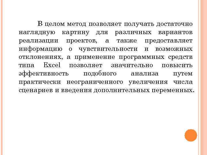 В целом метод позволяет получать достаточно наглядную картину для различных вариантов реализации проектов, а также предоставляет информацию о чувствительности и возможных отклонениях, а применение программных средств типа Excel позволяет значительно повысить эффективность подобного анализа путем практически неограниченного увеличения числа сценариев и введения дополнительных переменных.
