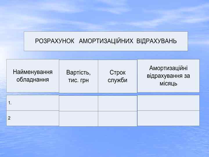 Основні параметри, які мають оцінюватися при розрахунку амортизаційних відрахувань виробничого обладнання ШПерелік основного та допоміжного обладнання (машин та устаткування), необхідних для здійснення виробничого процесу. ШРозрахунок витрат, пов'язаних з придбанням машин та устаткування. ШІнформація щодо вибору методу нарахування амортизаційних відрахувань, строків корисного використання та розрахунок амортизаційних відрахувань для кожної одиниці обладнання.