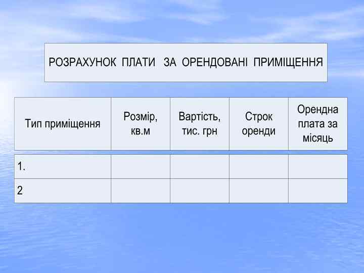 Основні параметри, які мають оцінюватися при розрахунку амортизаційних відрахувань (оренди) виробничих приміщень ШРозрахунок потреби у виробничих приміщеннях з урахуванням площі, яка необхідна для розміщення основного та допоміжного виробничого обладнання. ШВизначення способу отримання приміщень (купівля чи оренда). ШВизначення вартості, суми амортизаційних відрахувань чи орендної плати.