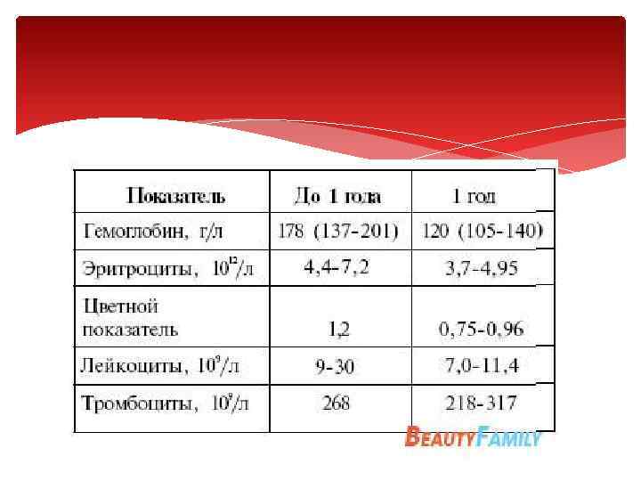 У детей первого года HB 119 -140 гл Эр-3, 5 -4 х10¹² в л СОЭ 4 -10 мм/ч L-10 - 11 х10 в 9 степени в л Григорьева Н. В. 6
