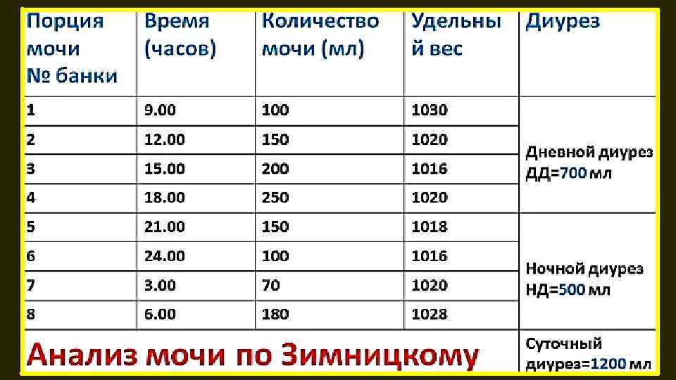 Анализ мочи по Зимницкому • Цель исследования: оценка фильтрационной и концентрационной функции почек • Техника сбора мочи: в течение суток, в 8 емкостей, с указанием номера порции и времени, каждая емкость рассчитана на сбор мочи в течение 3 х часов. • Оценка результатов: оценка плотности и объема в каждой порции мочи.