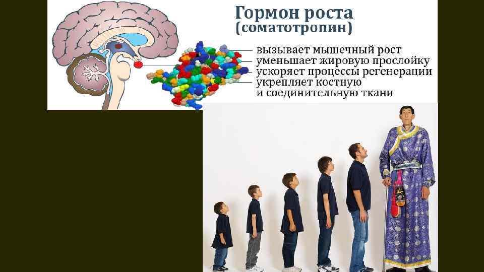 Избыточная продукция соматотропина у детей является причиной воз никновения ипофизарного гигантизма, проявляющегося г усиленным рос том, у взрослых кромегалией, а характеризующейся утолщением и де формацией костей, увеличением массы мягких тканей и внутренних ор ганов. Акромегалия