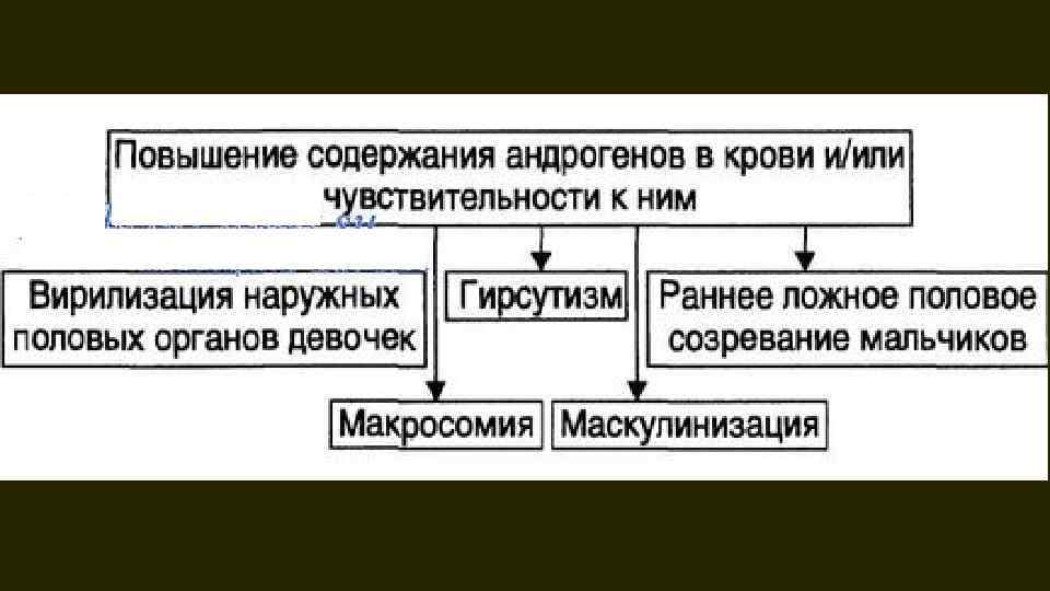 Адреногенитальный синдром (врожденная дисфункция коры надпочечников) спектр заболеваний, обусловленных дефектом ферментных систем, участвующих в биосинтезе стероидных гормонов надпочечников. В основе синдрома лежит наследственное нарушение биосинтеза кортизола, что вследствие существования механизма обратной связи приводит к повышенной секреции АКТГ и вторично к увеличенному производству андрогенов. Под влиянием андрогенов у девочек развивается вирилизация, а у мальчиков преждевременное развитие половых органов.
