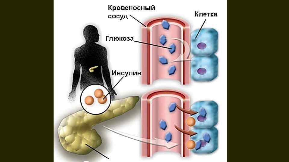 ГЛЮКОЗА Канал глюкозы ИНСУЛИН Рецептор к инсулину Глюкоза в крови Инсулин на рецепторе, открытие каналов глюкозы Глюкоза проникает в клетку через каналы глюкозы