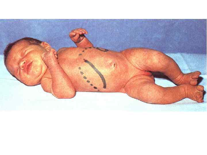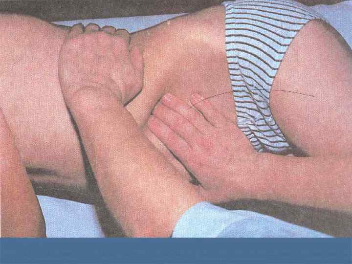 СИМПТОМ МЮССИ n При надавливании между ножками грудиноключично-сосцевидной мышцы справа – появляется боль в правом подреберье. n СИМПТОМ КЕРА n При надавливании в точке Кера (точка пересечения правой реберной дуги с наружным краем прямой мышцы живота) – появляется боль. n