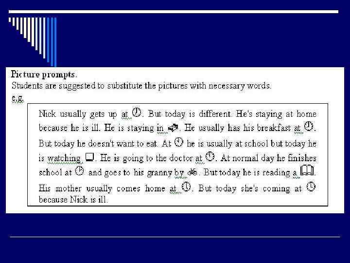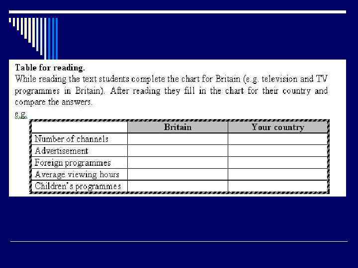 Чтение как цель и/или средство обучения 12. Найти изучаемое грамматическое явление в тексте и использовать его в своих предложениях. 13. Выполнить тест на проверку уровня сформированности лексикограмматических навыков. 14. Выполнить контрольное задание на проверку умения аудировать или писать на АЯ. 15. Узнать что-то новое.