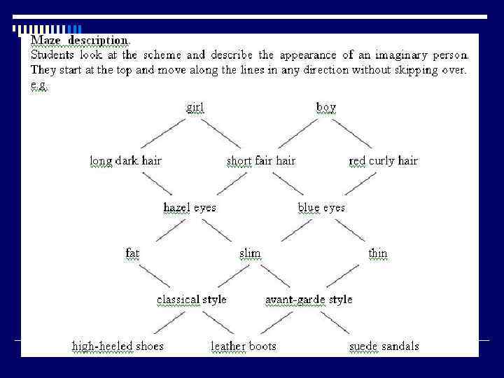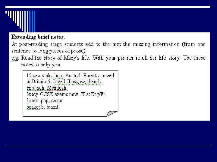 Навыки чтения на иностранном языке (Соловова Е. Н. ) o Игнорировать неизвестное, если оно не мешает выполнению коммуникативной задачи o Вычленять смысловую информацию o Читать по ключевым словам o Работать со словарем o Использовать сноски, комментарии o Интерпретировать и трансформировать текст