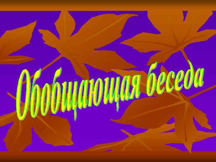 СТРУКТУРА ОБОБЩАЮЩЕЙ БЕСЕДЫ. Ø Ø Ø Начало беседы. Методы: обращение к детям, чтение стихотворения, показ картины, загадка, вопрос. Основная часть. Методы: вопросы, указания педагога, наглядный материал. Заключительная часть. Способы: изложить содержание беседы в кратком заключительном рассказе, повторяя самое существенное провести дидактическую игру на том же программном материале предложить детям прочитать знакомое стихотворение или спеть песню, близкую по содержанию теме беседы прочитать художественный рассказ дать задание на наблюдение или задание, связанное с трудовой деятельностью