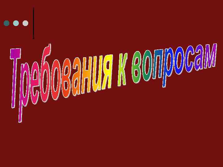 • формулируя вопрос, педагог должен ясно представить себе, какой ответ он ждет от ребенка • в вопросах не должно быть непонятных для детей слов • нельзя задавать вопросы в отрицательной форме, так как они провоцируют детей на от рицательный ответ • вопросы должны быть конкретными, четко сформулированными • не рекомендуется задавать вопросы, не способствующие развитию мысли • количество вопросов не должно загружать, затягивать • вопросы нужно формулировать в логической последовательности, не спеша, выделяя смысловые акценты при помощи логи ческого ударения или паузы