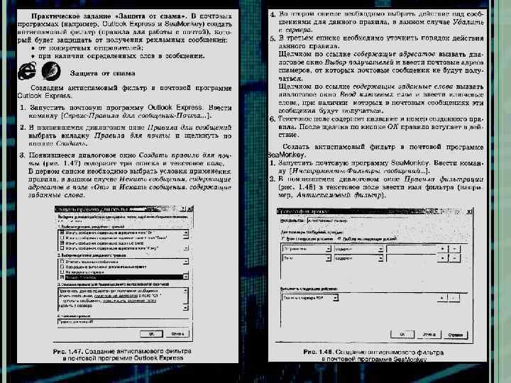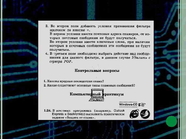 № п/п Этапы занятия 1 Организационный момент, постановка целей урока. 2 минуты 2 Актуализация знаний (вредоносная программа, вирусы). 3 минута 3 Спам. Виды и признаки спама. Защита от них. 9 минут 4 Практическая работа "Защита от спама". 10 -13 минут 5 Хакерские утилиты. Защита от них. 5 минут 6 Практическая работа "Настройка межсетевого экрана". 10 -13 минут 7 Задание на дом. 1 минута Презентация Временная реализация Конспект урока