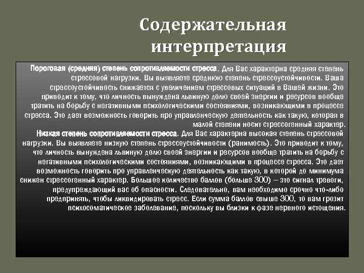 Содержательная интерпретация Пороговая (средняя) степень сопротивляемости стресса. Для Вас характерна средняя степень стрессовой нагрузки. Вы выявляете среднюю степень стрессоустойчивости. Ваша стрессоустойчивость снижается с увеличением стрессовых ситуаций в Вашей жизни. Это приводит к тому, что личность вынуждена львиную долю своей энергии и ресурсов вообще тратить на борьбу с негативными психологическими состояниями, возникающими в процессе стресса. Это дает возможность говорить про управленческую деятельность как такую, которая в малой степени носит стрессогенный характер. Низкая степень сопротивляемости стресса. Для Вас характерна высокая степень стрессовой нагрузки. Вы выявляете низкую степень стрессоустойчивости (ранимость). Это приводит к тому, что личность вынуждена львиную долю своей энергии и ресурсов вообще тратить на борьбу с негативными психологическими состояниями, возникающими в процессе стресса. Это дает возможность говорить про управленческую деятельность как такую, в которой до минимума снижен стрессогенный характер. Большое количество баллов (больше 300) – это сигнал тревоги, предупреждающий вас об опасности. Следовательно, вам необходимо срочно что-либо предпринять, чтобы ликвидировать стресс. Если сумма баллов свыше 300, то вам грозит психосоматическое заболевание, поскольку вы близки к фазе нервного истощения.