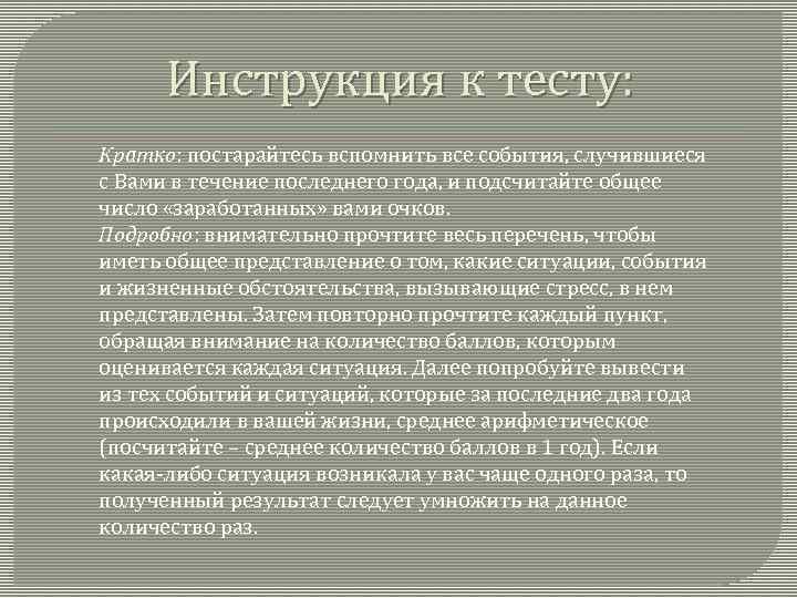 Инструкция к тесту: Кратко: постарайтесь вспомнить все события, случившиеся с Вами в течение последнего года, и подсчитайте общее число «заработанных» вами очков. Подробно: внимательно прочтите весь перечень, чтобы иметь общее представление о том, какие ситуации, события и жизненные обстоятельства, вызывающие стресс, в нем представлены. Затем повторно прочтите каждый пункт, обращая внимание на количество баллов, которым оценивается каждая ситуация. Далее попробуйте вывести из тех событий и ситуаций, которые за последние два года происходили в вашей жизни, среднее арифметическое (посчитайте – среднее количество баллов в 1 год). Если какая-либо ситуация возникала у вас чаще одного раза, то полученный результат следует умножить на данное количество раз.