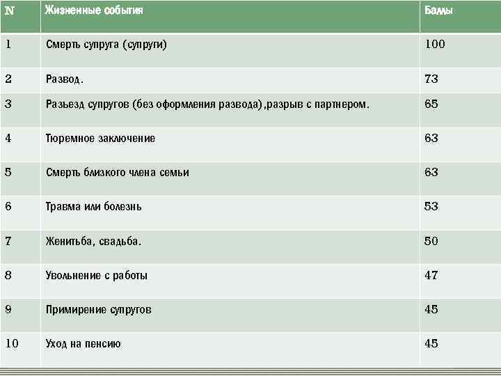 N Жизненные события Баллы 1 Смерть супруга (супруги) 100 2 Развод. 73 3 Разъезд супругов (без оформления развода), разрыв с партнером. 65 4 Тюремное заключение 63 5 Смерть близкого члена семьи 63 6 Травма или болезнь 53 7 Женитьба, свадьба. 50 8 Увольнение с работы 47 9 Примирение супругов 45 10 Уход на пенсию 45