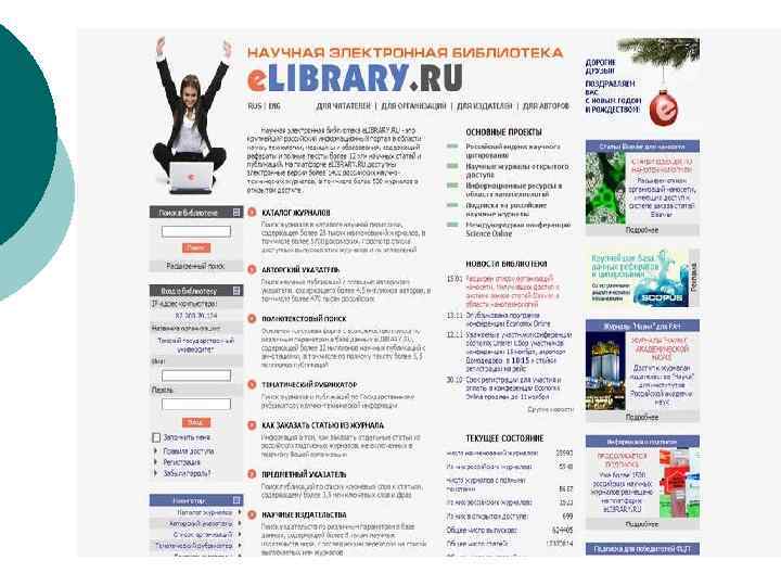 Научная электронная библиотека http: //www. elibrary. ru/ В рамках проекта Российского Фонда Фундаментальных исследований (РФФИ), который выполняется по „Программе поддержки российских научных библиотек“, НБ ТГУ и все читатели библиотеки получили доступ к научной электронной библиотеке журналов по всем направлениям фундаментальной науки и к ресурсам издательств.