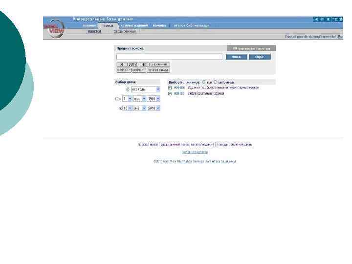 EAST VIEW http: //ebiblioteka. ru/ Доступ к десяткам ведущих российских периодических публикаций по гуманитарным наукам — журналам институтов Российской Академии наук, охватывающим области от археологии до лингвистики, так называемым „толстым журналам“, начиная со знаменитого „Нового мира“, и независимым научным журналам. База данных регулярно пополняется новыми названиями. Полные тексты исследований и художественных произведений воспроизводятся с нумерацией страниц оригинала, облегчающей библиографические ссылки на источники.