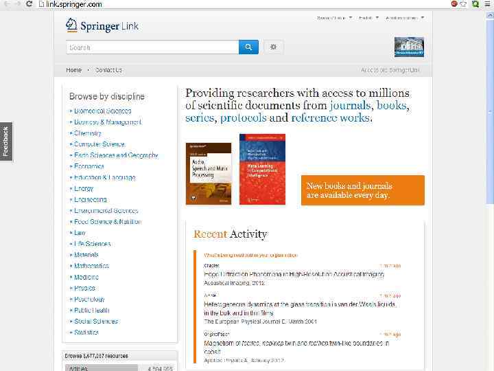 Springer. Link http: //www. springerlink. com/ Политематическая база данных, содержащая более 1 400 журналов, 10 000 книг (монографии, справочники, энциклопедии, учебники и др. ). Русская коллекция журналов издательства „Наука“ (англ. яз). Книги доступны для скачивания только по главам.