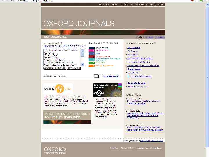 Oxford University Press http: //www. oupjournals. org/ Научные журналы издательства Оксфордского университета представляют интерес для специалистов различных отраслей знаний. В базе данных представлено большое количество реферируемых журналов (из 170 журналов в базе данных ВИНИТИ представлены 118), получивших высокую оценку мирового научного сообщества. Глубина полнотекстового архива с 1996 г.